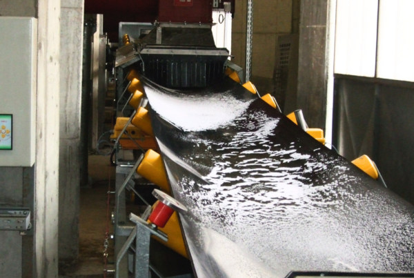 The belt conveyor is the "standard conveyor belt" for many applications. Large conveying lengths, conveying quantities and conveying speeds can already be realized with relatively low drive power. The usually smooth carrying side of the rubber band is well suited to withstand mechanical wear, chemical effects caused by the conveyed goods, moisture or bacteriological influences. The disadvantage of the limited pitch angle can be compensated for by profiling the belt.